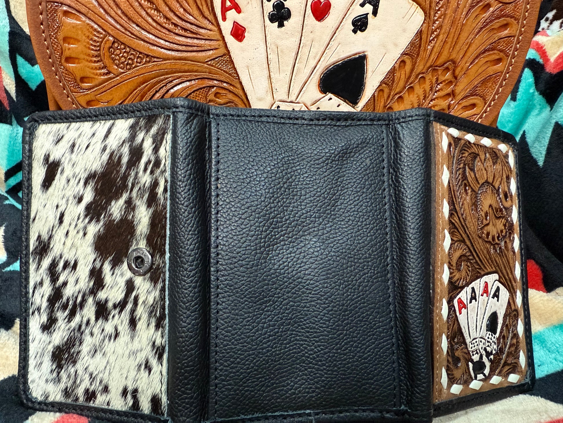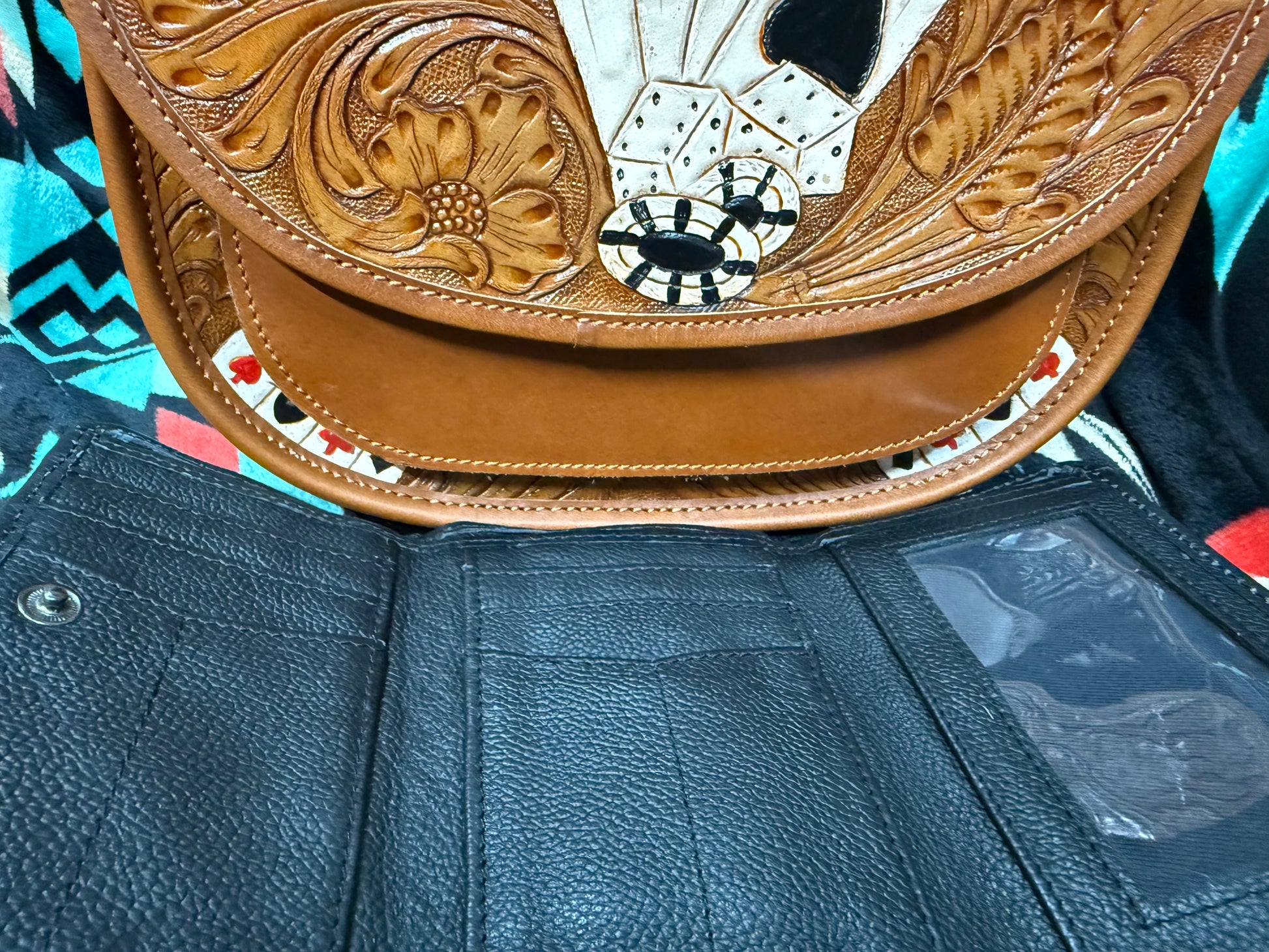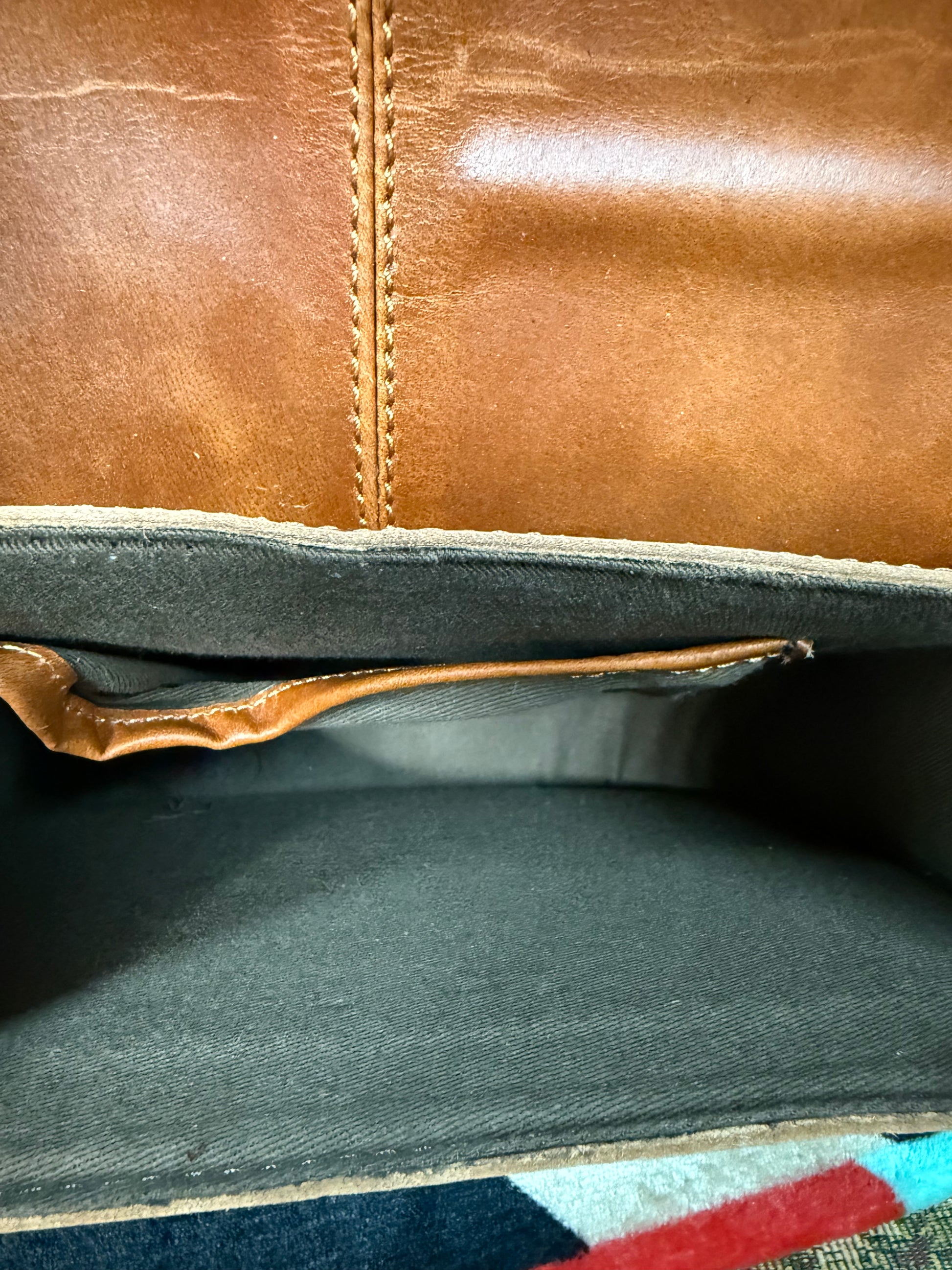 Full leather crossbody with slim guitar style strap. Does not adjust but is removable.