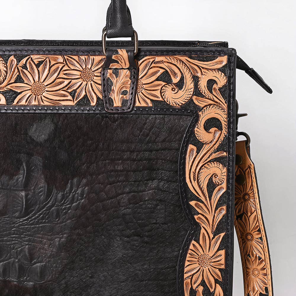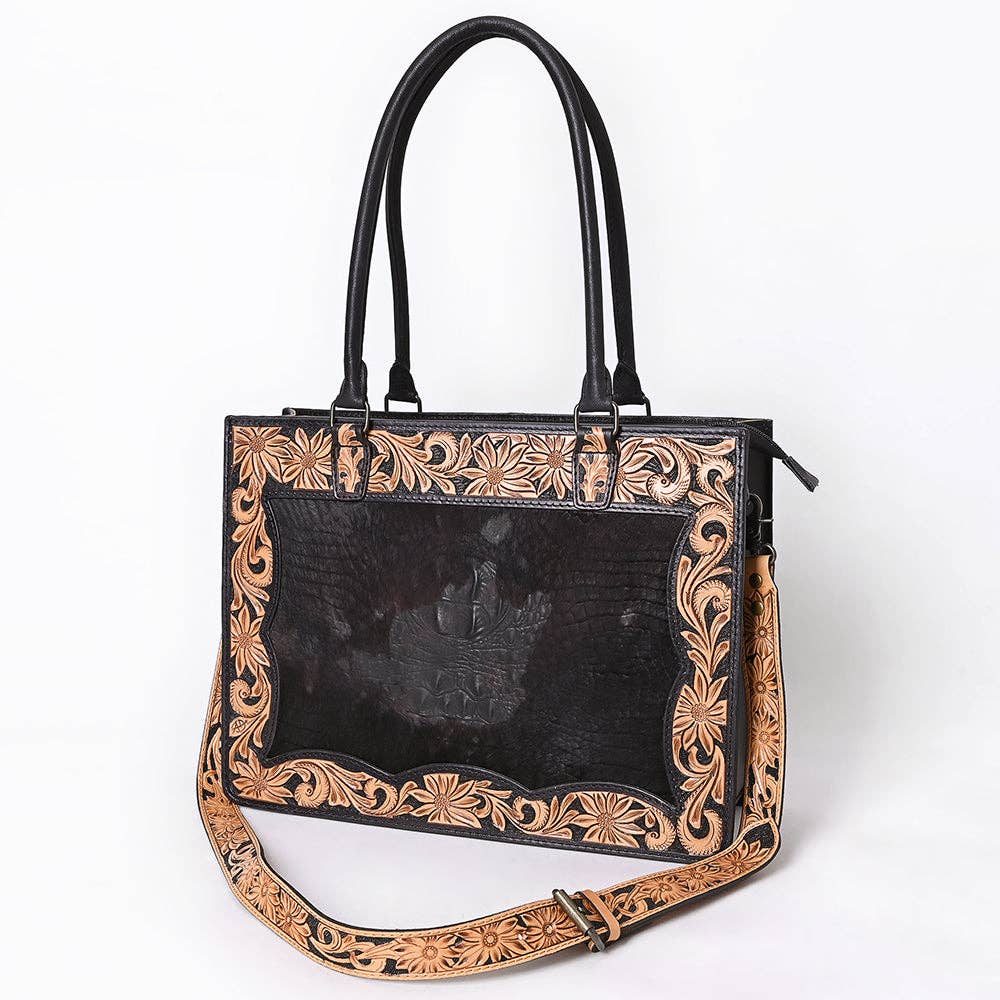 Bold elegance meets traditional Western artistry in this handcrafted black leather tote bag. The center features a croc-embossed leather panel framed by an intricate tan floral tooled border, extending across the handles and the detachable shoulder strap for a cohesive, standout look.