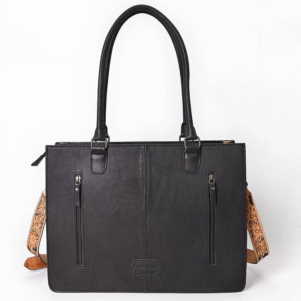 ADBG1605 Black Leather Tote Bag with Floral Tooled Border & Croc-Embossed Center