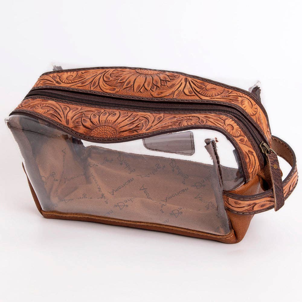 Travel in Western style with this handcrafted Clear Toiletry Bag from American Darling. Designed for both function and fashion, this travel pouch features a transparent, heavy-duty vinyl body trimmed with hand-tooled vegetable-tanned leather adorned with detailed floral sunburst patterns.
