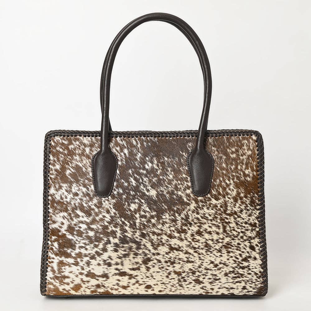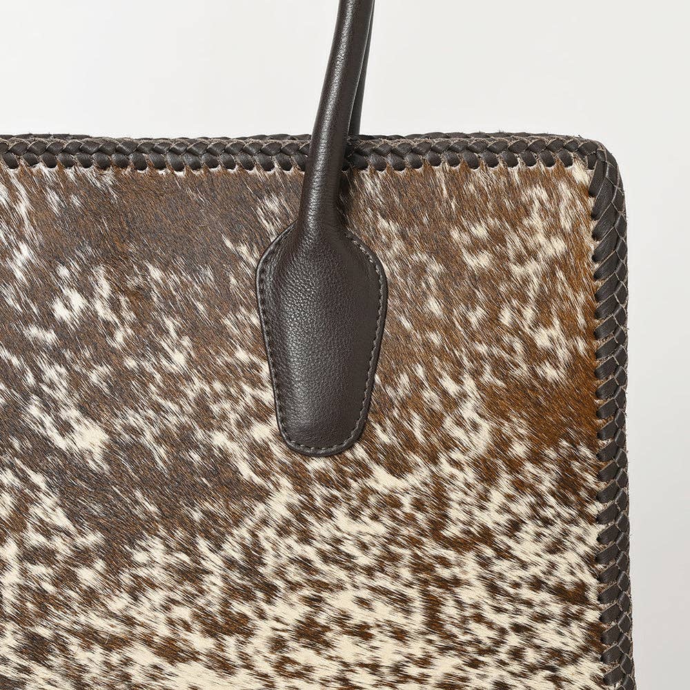 Sleek, structured, and unapologetically Western, this Speckled Cowhide Leather Tote Bag blends elegance and ranch-ready charm. Made from genuine hair-on cowhide with a striking natural speckled pattern, this carryall features smooth dark leather handles and reinforced edges with hand-braided trim. Spacious and stylish, it's perfect for daily use or elevating your Western wardrobe.