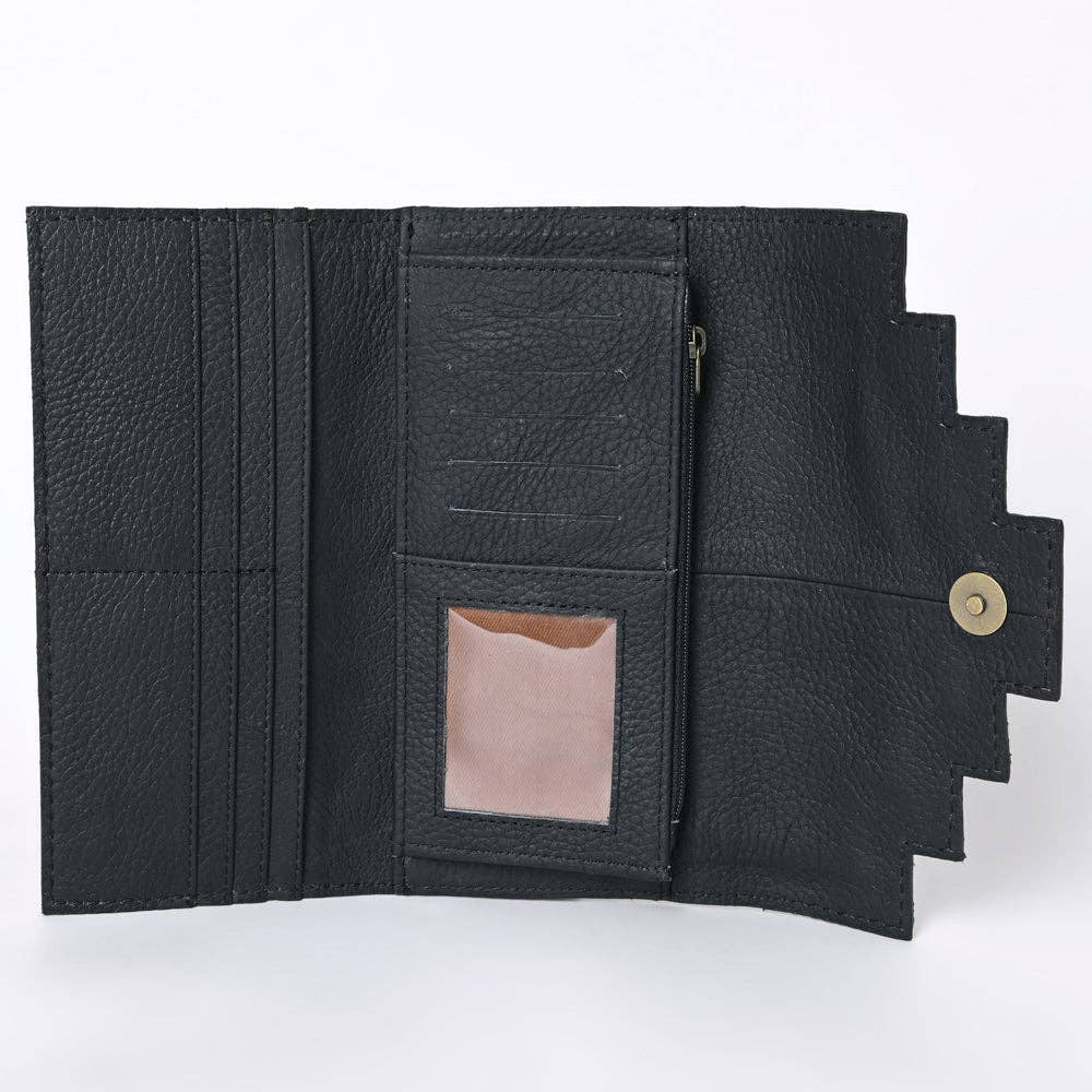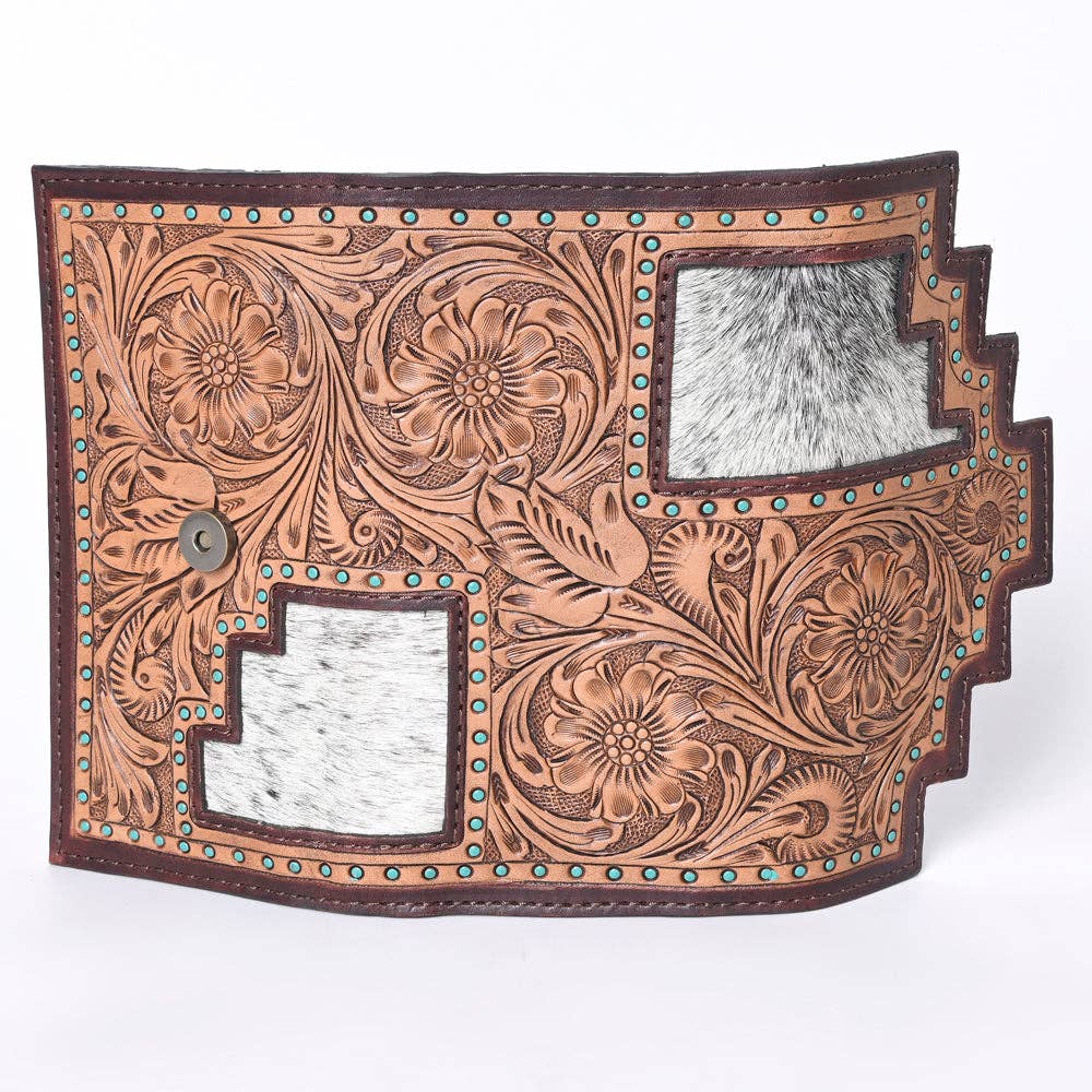 Detailed Hand tooled, carved and finally antique hand finished exquisitely done by the finest artists and craftsmen in the country. Vegetable tanned American Genuine Cowhide Leather. High quality Genuine Top Grain Leather. Soft and supple leather that ages beautifully as it wears. The handpicked cowhide hair-on genuine leather not only adds a soft and tactile element but also serves as an embellishment, enhancing its overall western appearance. Genuine YKK brand known for long lasting and durable zipper closures ensure security of your essentials. Size/Dimensions: 4.5in (H) X 8.5in (W) An affordable western handcrafted leather collection designed here in the heart of Texas. These gorgeous creations deliver a blend of western culture and heritage along with the latest fashion and trendy appeal at a very affordable price. It makes your appearance eye-catching by its amazing colors, materials, and meticulous hand work. Eco friendly genuine leather is handpicked and sourced from some of the best tanneries...