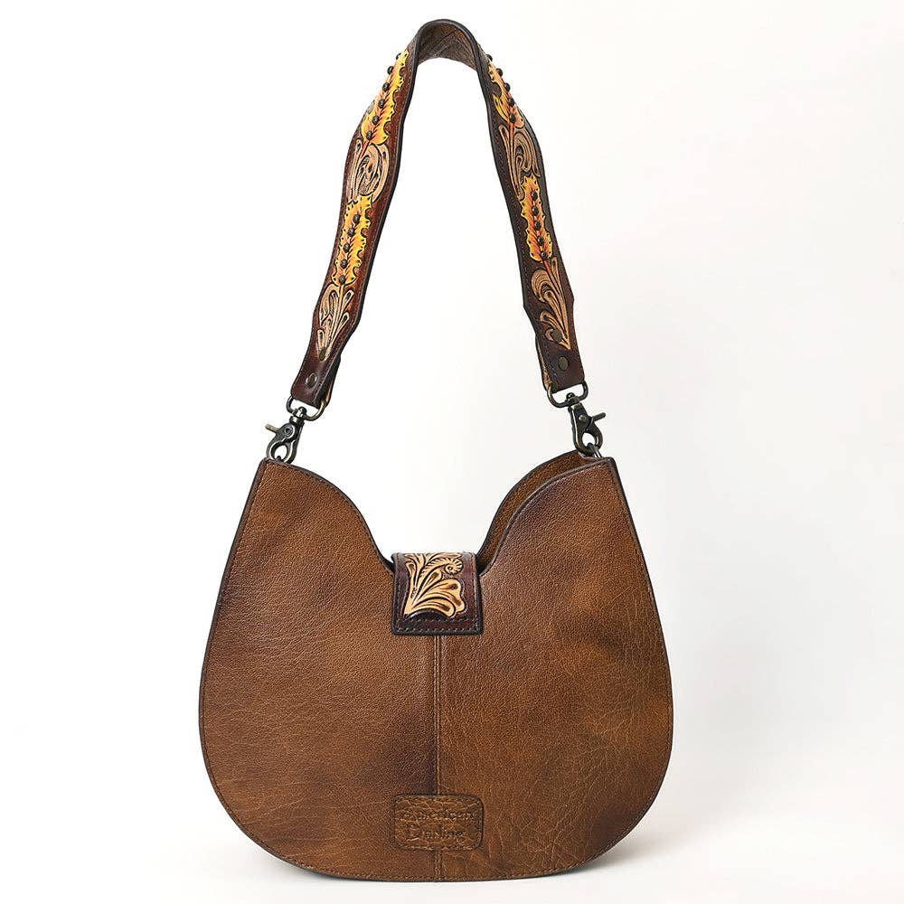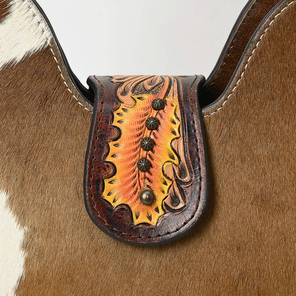 Stand out with the bold beauty of this Western hobo bag, crafted from genuine hair-on cowhide in a rich tan and white pattern. The saddle-shaped body is complemented by a wide, hand-tooled leather shoulder strap, featuring intricate floral carvings accented with hand-painted orange and yellow tones.