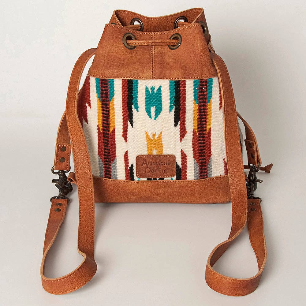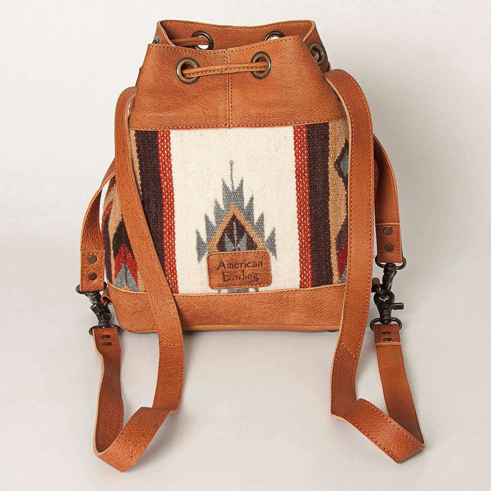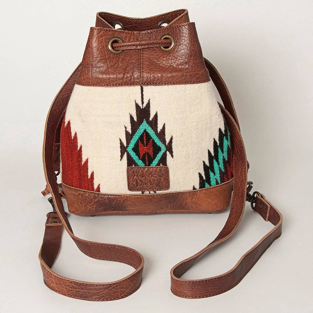 Elevate your Western wardrobe with the charm of this American Darling Leather Bucket Bag, a perfect blend of rustic elegance and modern versatility. Featuring a structured drawstring silhouette, this bag is crafted from rich full-grain leather and adorned with a hand-woven wool saddle blanket in vibrant Southwestern patterns.