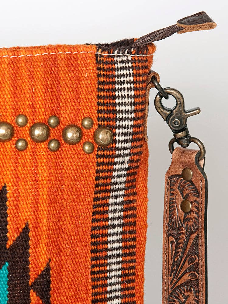 LC-ADBG865 Orange Southwestern Saddle Blanket Crossbody Bag with Tooled Leather Strap & Stud Accents