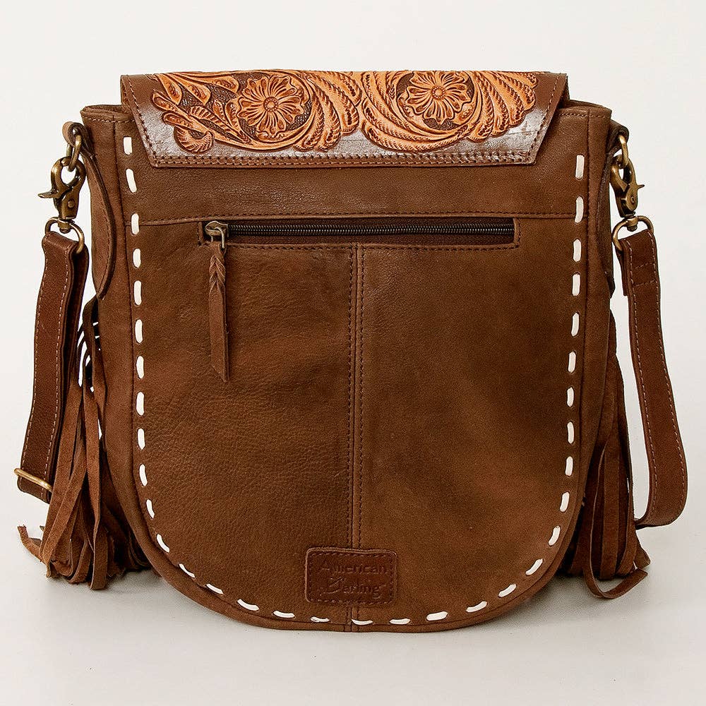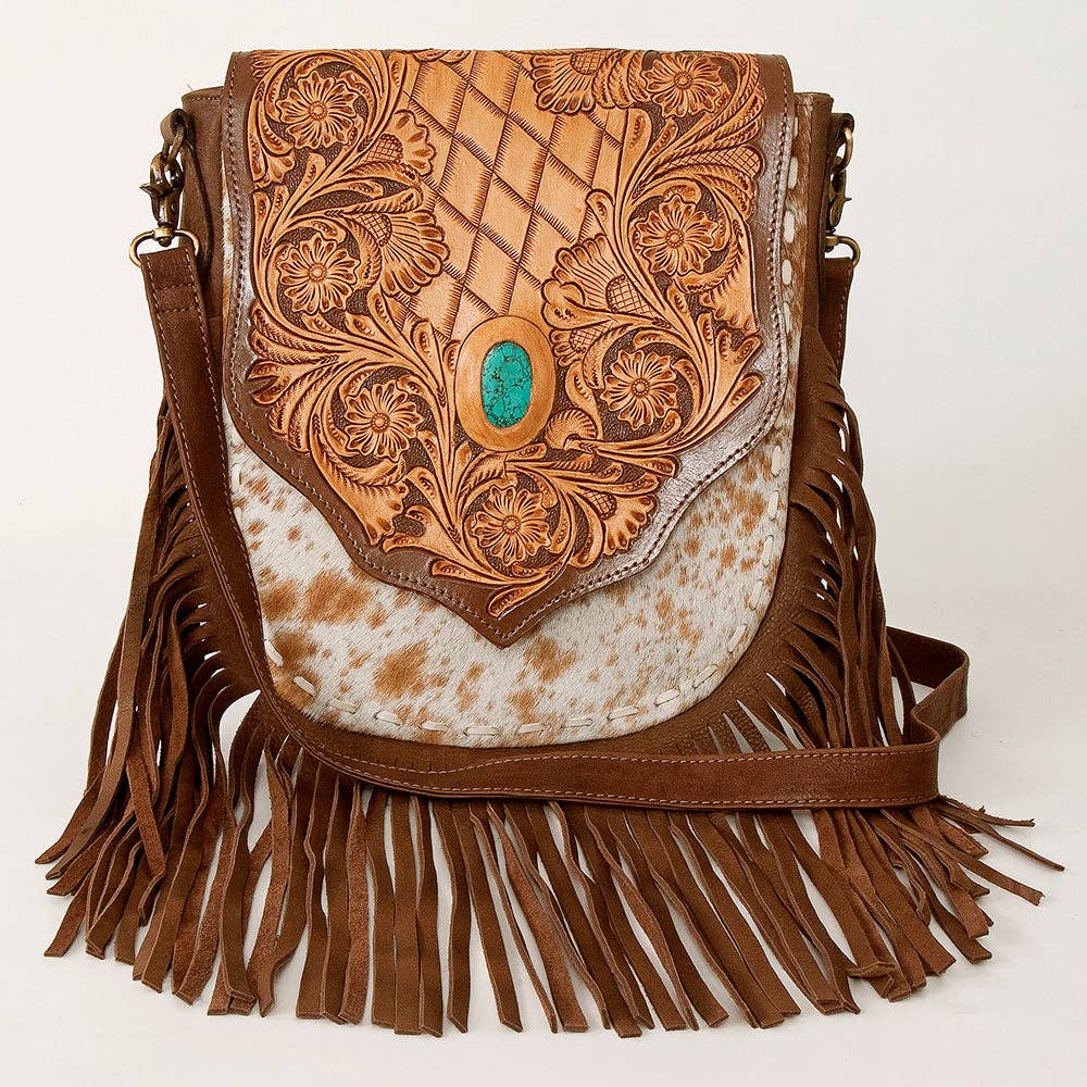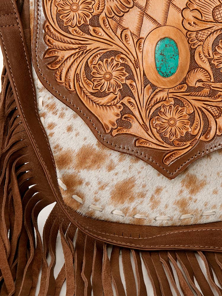 Detailed Hand tooled, carved and finally antique hand finished vegetable tanned American Cowhide Leather, exquisitely done by the finest artists and craftsmen in the country. High quality Genuine Full Grain Leather. Soft and supple leather that ages beautifully as it wears. The handpicked cowhide hair-on genuine leather not only adds a soft and tactile element but also serves as an embellishment, enhancing its overall western appearance. Decorated with beautiful leather fringes giving it a western look. Adjustable genuine leather shoulder strap. Highly durable solid Antique finish metal fittings. Genuine brand known for long lasting and durable zipper closures ensure security of your essentials. Eye catching Turquoise Stone. Size/Dimensions: 12in (H) X 11in (W) X 2.5in (D) A luxurious and western handcrafted leather collection designed by American Darling here in the heart of Texas.