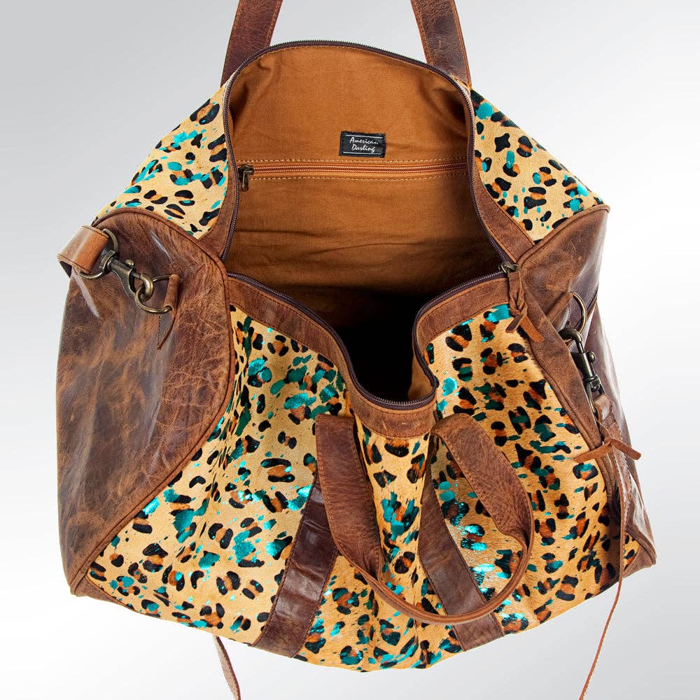 High quality Genuine Full Grain Leather. Soft and supple leather that ages beautifully as it wears. The handpicked cowhide hair-on genuine leather not only adds a soft and tactile element but also serves as an embellishment, enhancing its overall western appearance. Adjustable genuine leather shoulder strap. Highly durable solid Antique finish metal fittings. Genuine YKK brand known for long lasting and durable zipper closures ensure security of your essentials. Size/Dimensions: 12in (H) X 21in (W) X 11.5in (D) A luxurious and western handcrafted leather collection designed by American Darling here in the heart of Texas. These gorgeous creations deliver a blend of western culture and heritage along with the latest fashion and trendy appeal. It makes your appearance eye-catching by its amazing colors, materials, and meticulous hand work. Eco friendly genuine leather is handpicked and sourced from some of the best tanneries in the world.