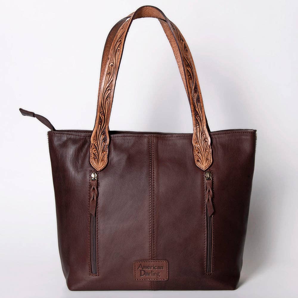 LC-ADBGZ694 Genuine Cowhide Leather Tote Bag with Hand-Tooled Floral Patch - Western Shoulder Bag